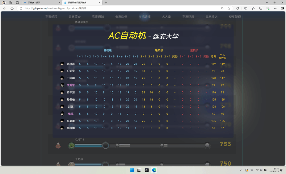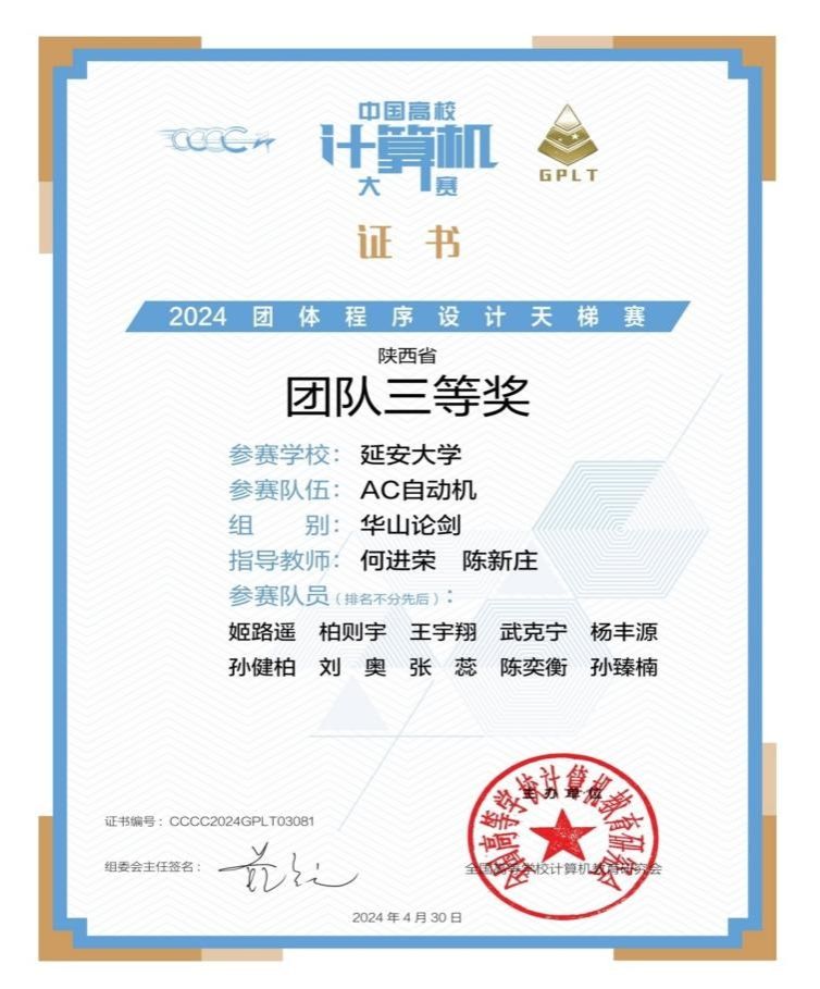 4月20日午,我院以线上参赛方式成功举办第九届中国高校计算机大赛—团体程序设计天梯赛,这是我校首次参与该项竞赛。全院三支队伍共30名学生参加了本次比赛,并顺利完成了竞赛,大赛成绩近日揭晓,其中“AC自动机”队的十名队员获得“华山论剑”组团队省赛三等奖,进一步激发了我校学生参与竞赛的热情,通过竞赛提升专业技能,达到了以赛促教以赛促学的目的。