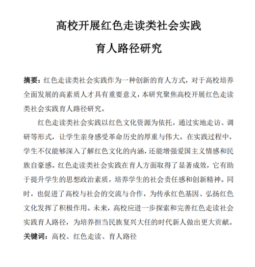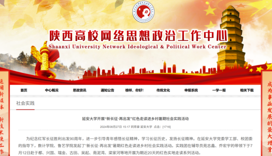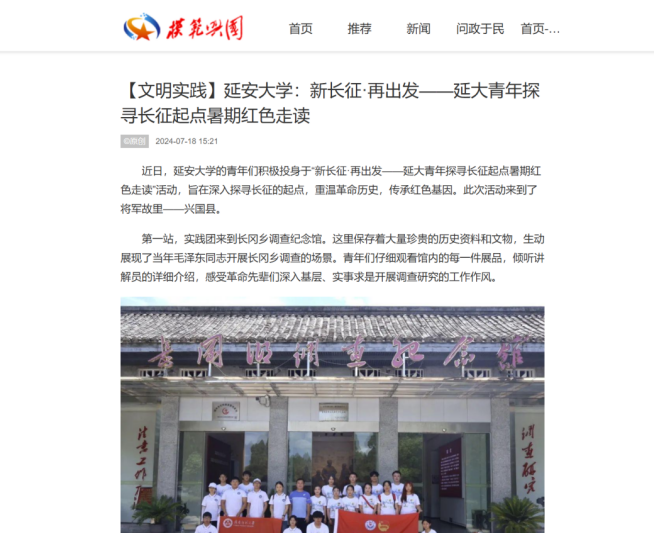 党委学工部、校团委的指导下,联合发起了“新长征·再出发”暑期红色走读进乡村社会实践活动,组建15人师生团队。实践团以“延安革命旧址是一本永远读不完的书”为精神指引,利用暑期20余天的时间实地走访江西、福建、陕西等地,将学习、调研、分享相结合,坚持从真实动人的“革命书本”中探寻高校开展“实地走读+”实践育人的有效路径,最大范围的号召新时代青年进一步领悟传承红色基因的价值意蕴。