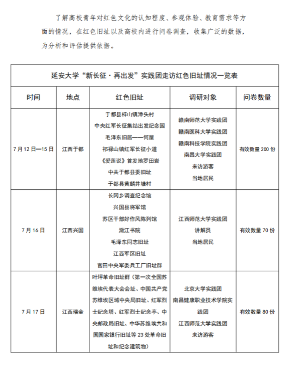 实践团历经27小时火车硬座跨越一千七百公里从长征落脚点陕西延安顺利抵达江西赣州和福建古田,随后返延进一步开展实践总结,走读期间主要针对长征历史的两个方面开展学习活动。