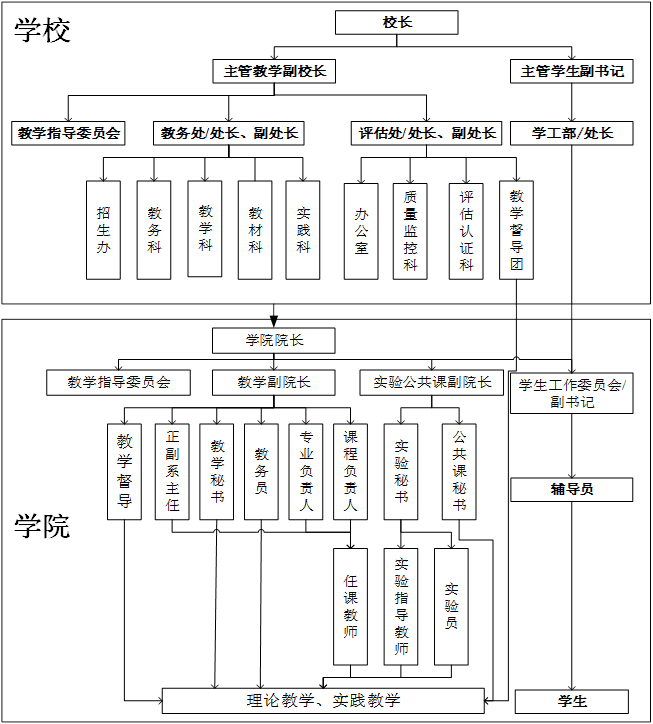 校长作为教育教学质量的首要责任人,负责全校教学的宏观管理。主管教学副校长具体负责全校教学工作的组织领导,主管学生的党委副书记具体负责学生管理的组织领导。
