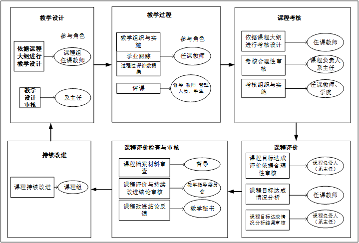 课程负责人、任课教师、实验指导教师负责课程大纲的修订或制定、组织课程教学活动、对教学过程实施管理并评价学生的学习成效,以及落实课程持续改进工作。